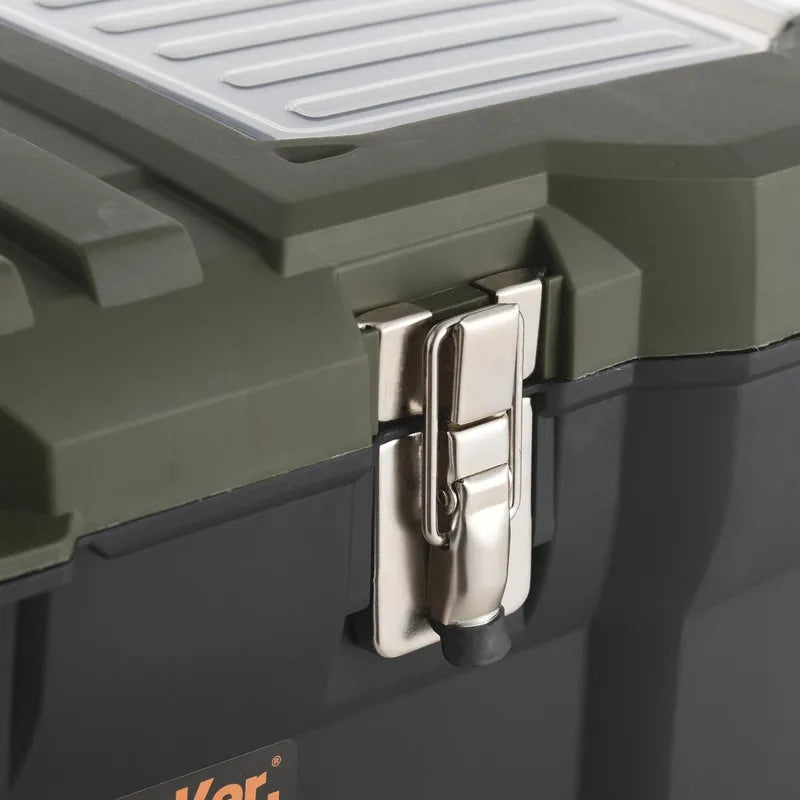 Fabricada en plástico resistente, esta caja cuenta con un cierre tipo clip para mantener tus herramientas seguras. En su interior, encontrarás un compartimento adicional con tapa transparente para organizar mejor tus piezas pequeñas. Con un volumen de 56 litros y medidas de 26 cm de largo y 31 cm de alto, tendrás espacio de sobra para todo lo que necesitas. El asa superior facilita su transporte.