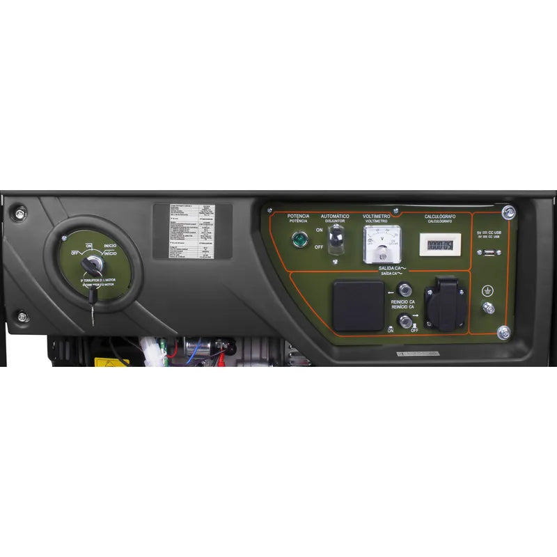 Este generador cuenta con un motor de 419 cc y una potencia de motor de 5000 W, además de un estanque de 25 l de capacidad. Su voltaje es de 220 V y funciona con gasolina. Incluye un regulador de voltaje y un nivel de ruido de 103 dB. Su diseño compacto de 75.8 cm de largo, 66.3 cm de ancho y 63.5 cm de alto, lo hace fácil de transportar.